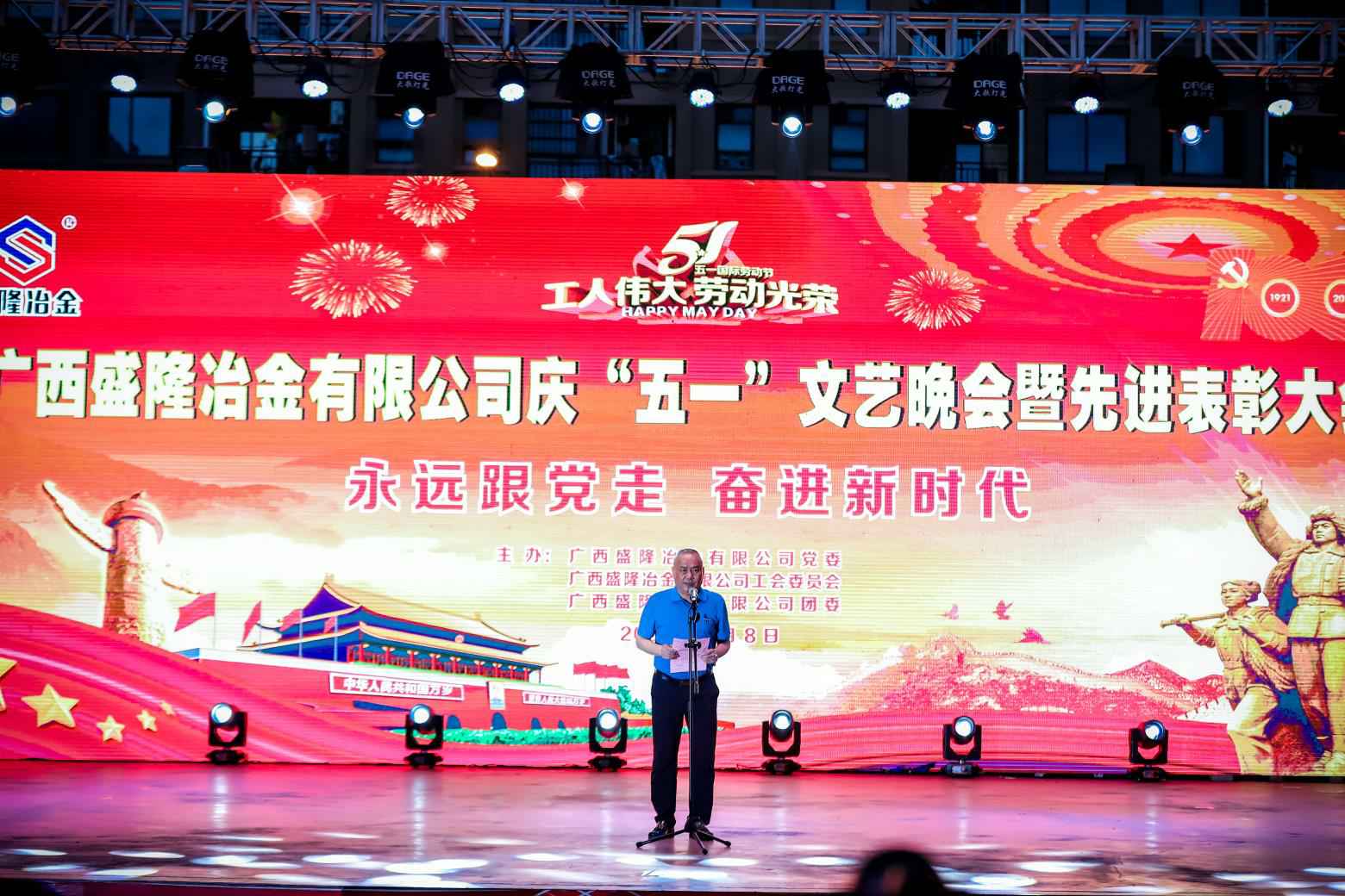 5月8日晚,千亿体育·网站官网-千亿online(中国)盛隆佳园文化广场歌声嘹亮,掌声如潮。由千亿体育·网站官网-千亿online(中国)党委、工会委员会、团委联合主办的“永远跟党走,奋进新时代——庆‘五一’文艺晚会暨先进表彰大会”在这里隆重举行。公司常务副总经理陈亮出席晚会并致辞,副总经理兼安环总监吕华民、副总经理兼技术中心主任刘光穆、总工程师兼规划发展部经理梁新亮、总经理助理兼广西广盛高强耐磨新材料有限公司总经理王文凯、党委常务副书记游元喜、工会主席兼总经理办公室主任刘明奇及各厂部主要领导出席。